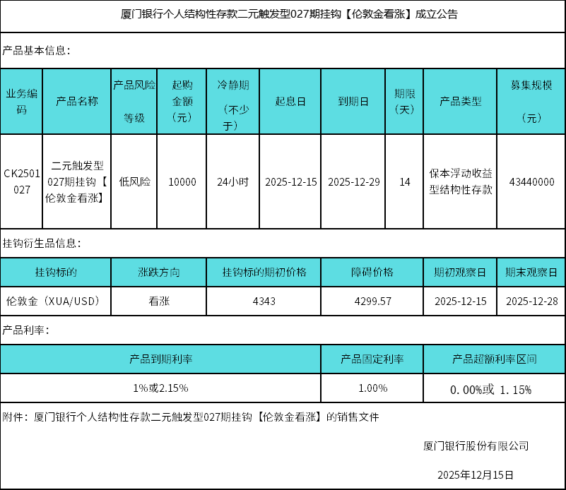 廈門銀行個人結(jié)構(gòu)性存款二元觸發(fā)型027期掛鉤【倫敦金看漲】成立公告