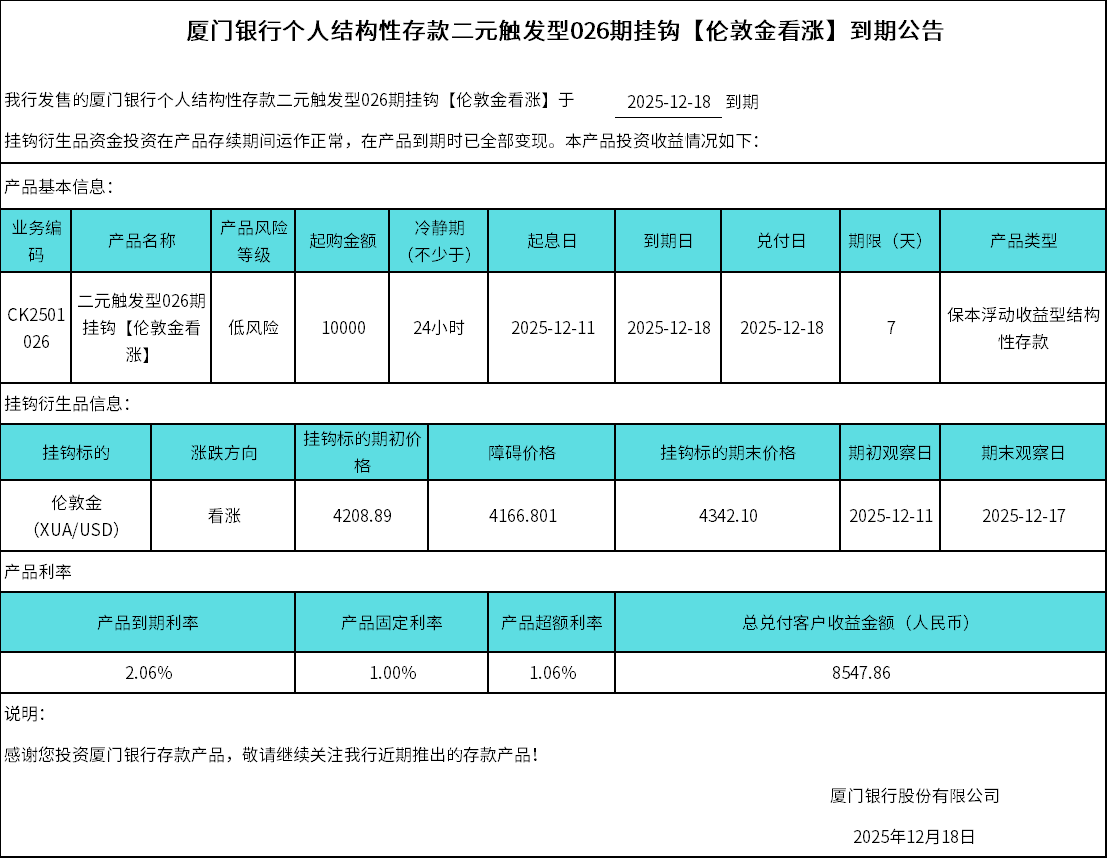 廈門銀行個(gè)人結(jié)構(gòu)性存款二元觸發(fā)型026期掛鉤【倫敦金看漲】到期公告