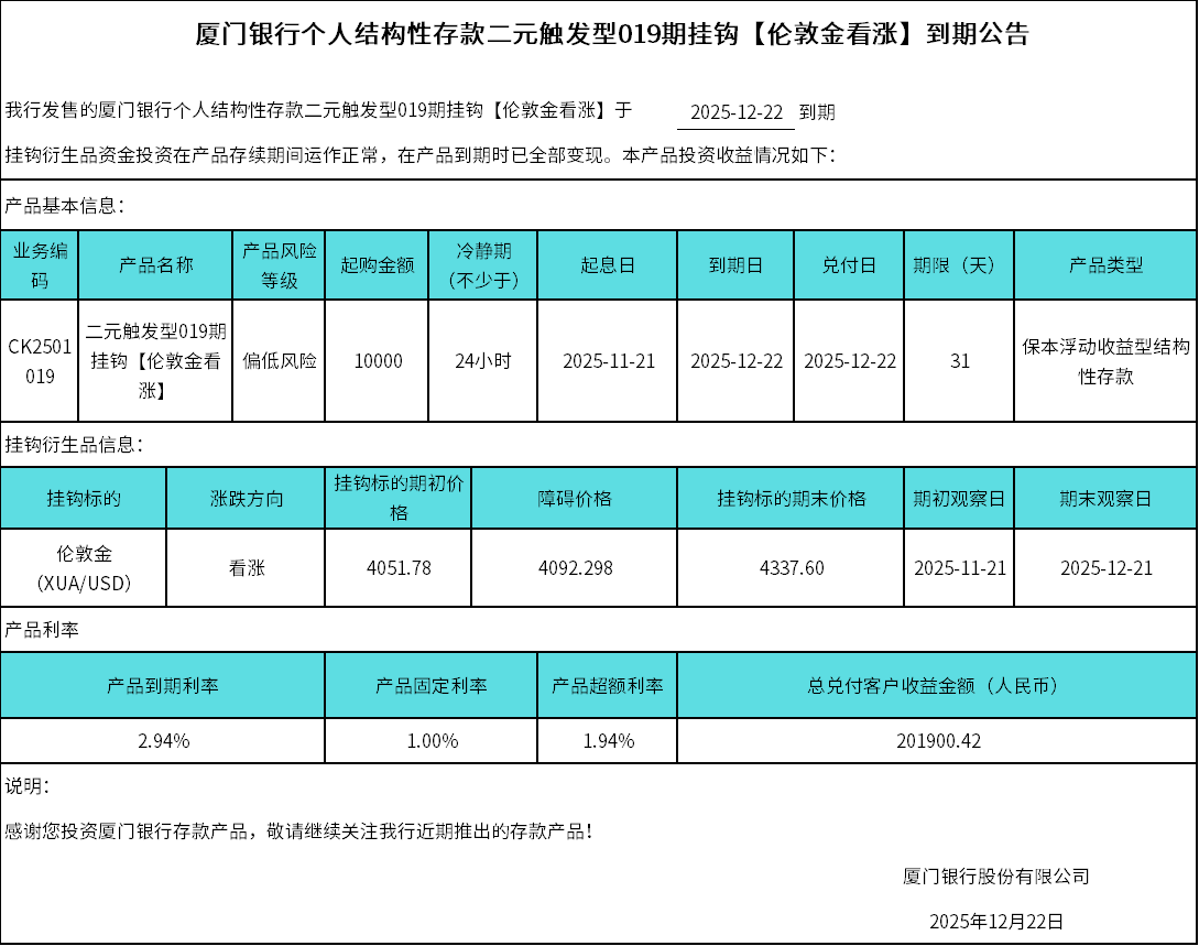 廈門銀行個(gè)人結(jié)構(gòu)性存款二元觸發(fā)型019期掛鉤【倫敦金看漲】到期公告