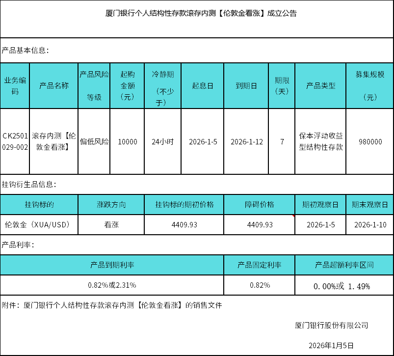 廈門銀行個(gè)人結(jié)構(gòu)性存款滾存內(nèi)測(cè)【倫敦金看漲】成立公告 日期:2026-01-05 15:22:23 廈門銀行個(gè)人結(jié)構(gòu)性存款二元觸發(fā)型029-002期掛鉤【倫敦金看漲】銷售文件.zip 返回 下一篇