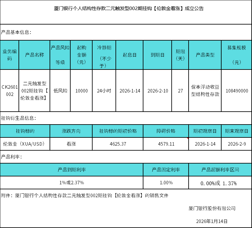 廈門(mén)銀行個(gè)人結(jié)構(gòu)性存款二元觸發(fā)型002期掛鉤【倫敦金看漲】成立公告