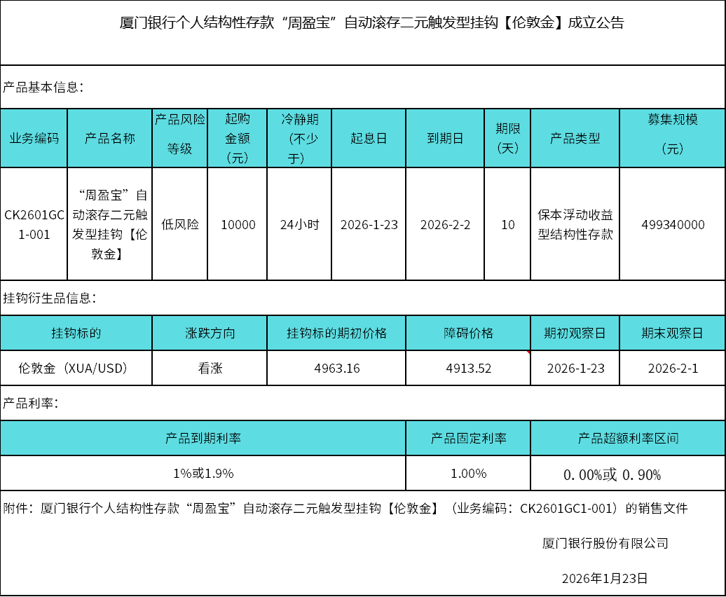 廈門(mén)銀行個(gè)人結(jié)構(gòu)性存款“周盈寶”自動(dòng)滾存二元觸發(fā)型掛鉤【倫敦金】成立公告 日期:2026-01-23 15:29:17 廈門(mén)銀行個(gè)人結(jié)構(gòu)性存款二元觸發(fā)型CK2601GC1-001期掛鉤【倫敦金】銷售文件.zip 返回 下一篇