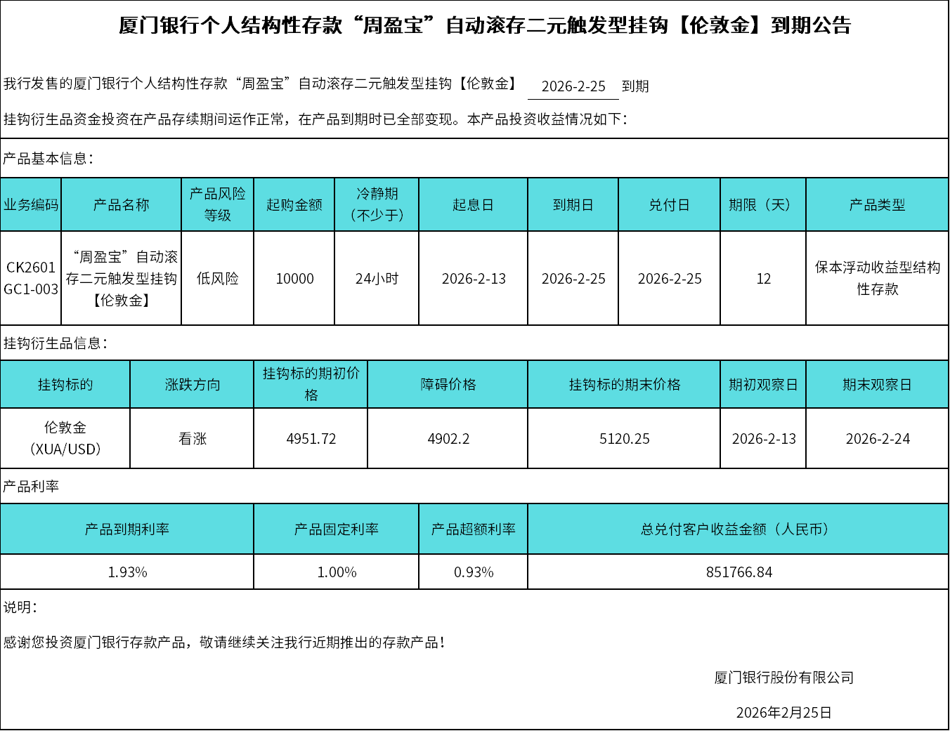 廈門(mén)銀行個(gè)人結(jié)構(gòu)性存款“周盈寶”自動(dòng)滾存二元觸發(fā)型掛鉤【倫敦金】到期公告