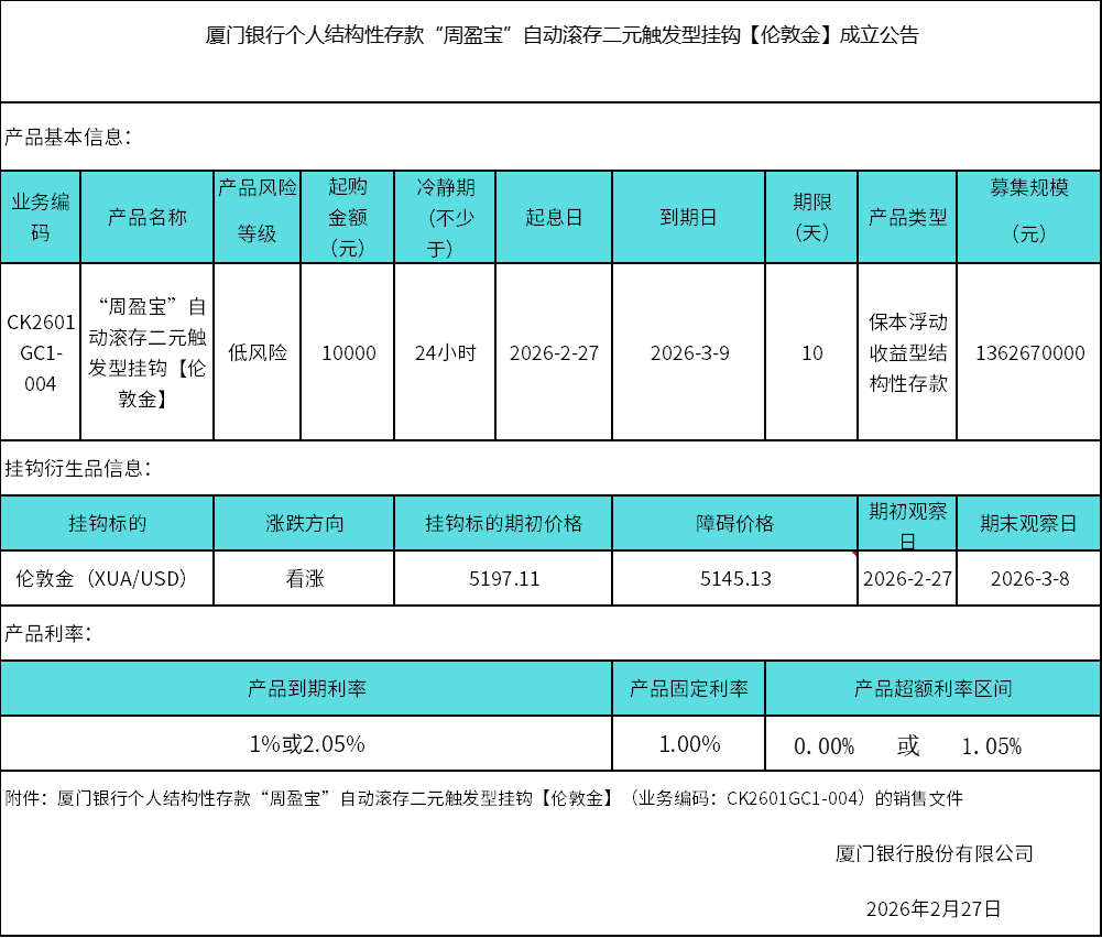 廈門銀行個(gè)人結(jié)構(gòu)性存款“周盈寶”自動(dòng)滾存二元觸發(fā)型掛鉤【倫敦金】成立公告 日期:2026-02-27 16:34:27 廈門銀行個(gè)人結(jié)構(gòu)性存款二元觸發(fā)型CK2601GC1-004期掛鉤【倫敦金】銷售文件.zip 返回 下一篇