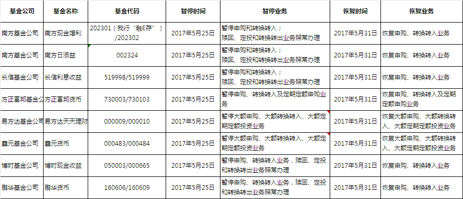 1、2017年5月25日至5月30日,根據(jù)各基金公司安排為保護(hù)基金份額持有人權(quán)益貨幣型基金業(yè)務(wù)將暫停,2017年5月31日,各項(xiàng)業(yè)務(wù)將恢復(fù)正常,屆時(shí)不再公告,最終以基金公司發(fā)布公告為準(zhǔn)。