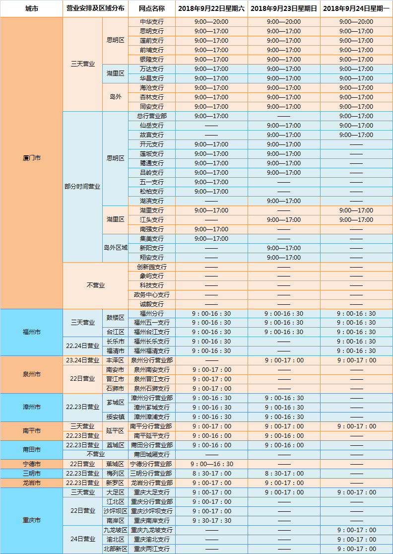 廈門(mén)銀行2018年中秋節(jié)假期網(wǎng)點(diǎn)營(yíng)業(yè)時(shí)間通告