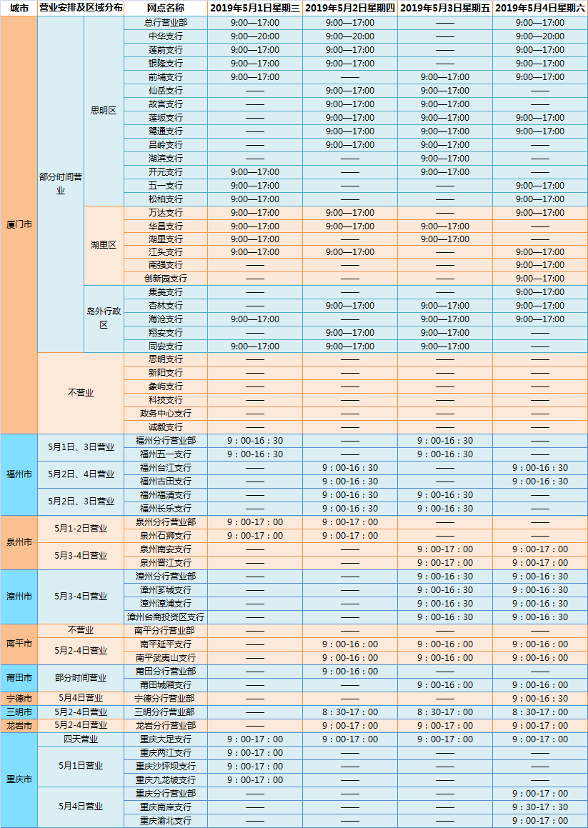 廈門(mén)銀行2019年勞動(dòng)節(jié)假期網(wǎng)點(diǎn)營(yíng)業(yè)時(shí)間通告