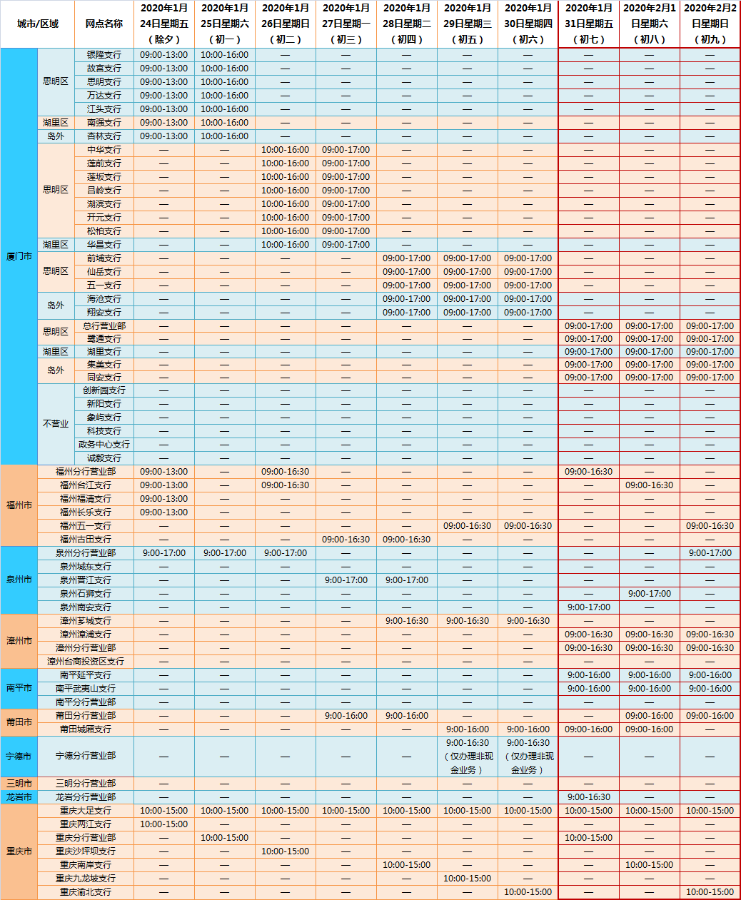 廈門銀行2020年春節(jié)放假期間營業(yè)網(wǎng)點(diǎn)調(diào)整