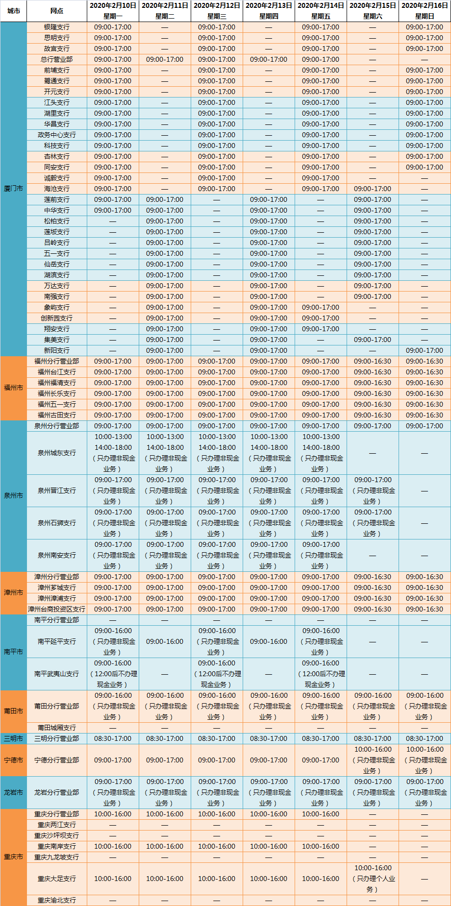 廈門銀行2020年2月10日-16日各網(wǎng)點(diǎn)營(yíng)業(yè)時(shí)間安排的通知