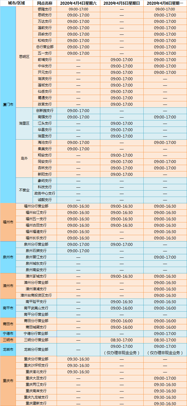 廈門銀行2020年清明節(jié)假期網(wǎng)點(diǎn)對(duì)外營(yíng)業(yè)時(shí)間通告