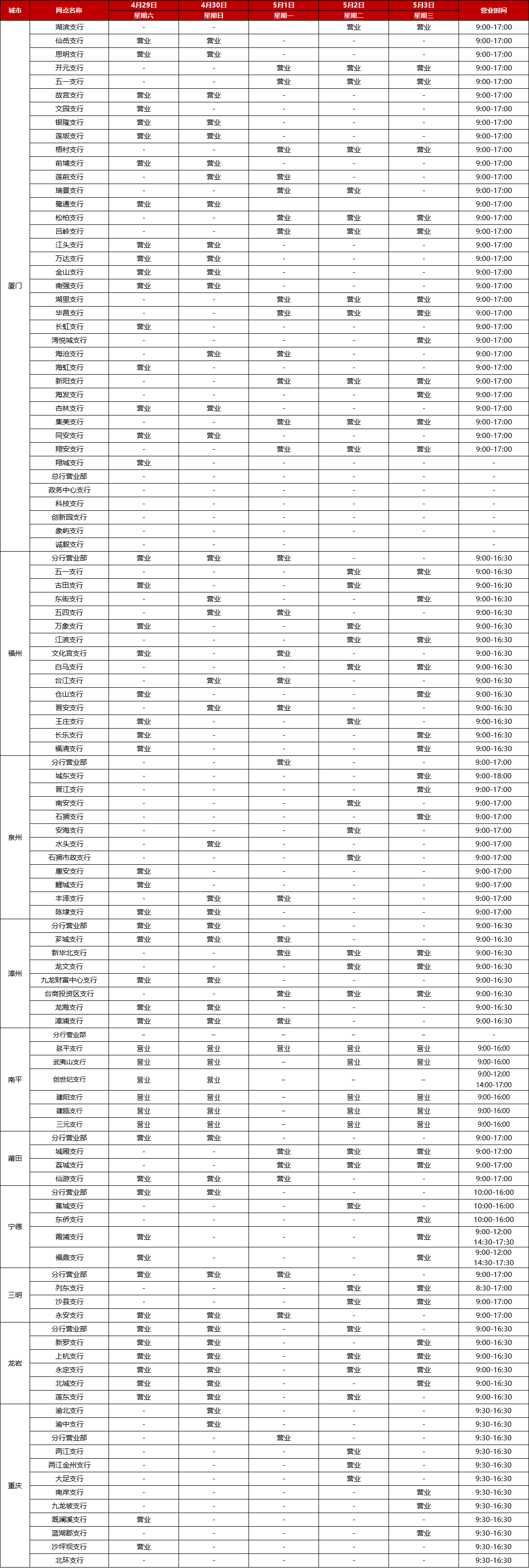 廈門銀行2023年勞動節(jié)假期網點對外營業(yè)時間通告