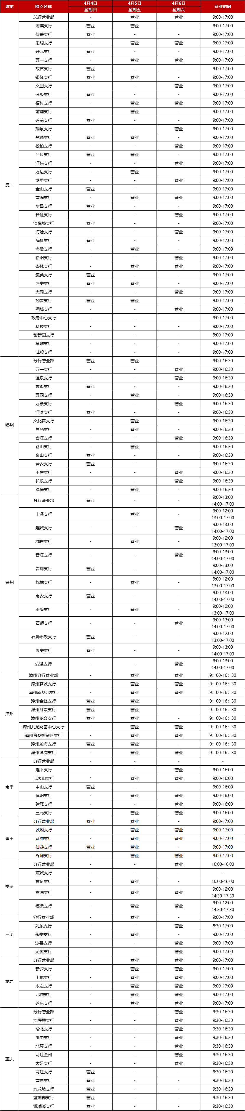 廈門銀行2024年清明節(jié)假期網(wǎng)點(diǎn)對外營業(yè)時間通告