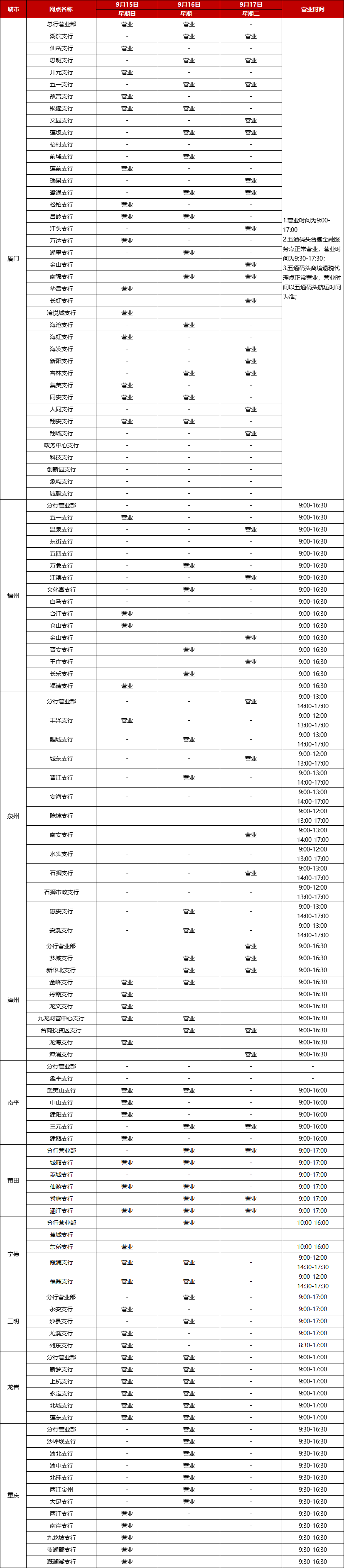 廈門銀行2024年中秋節(jié)假期網(wǎng)點對外營業(yè)時間通告