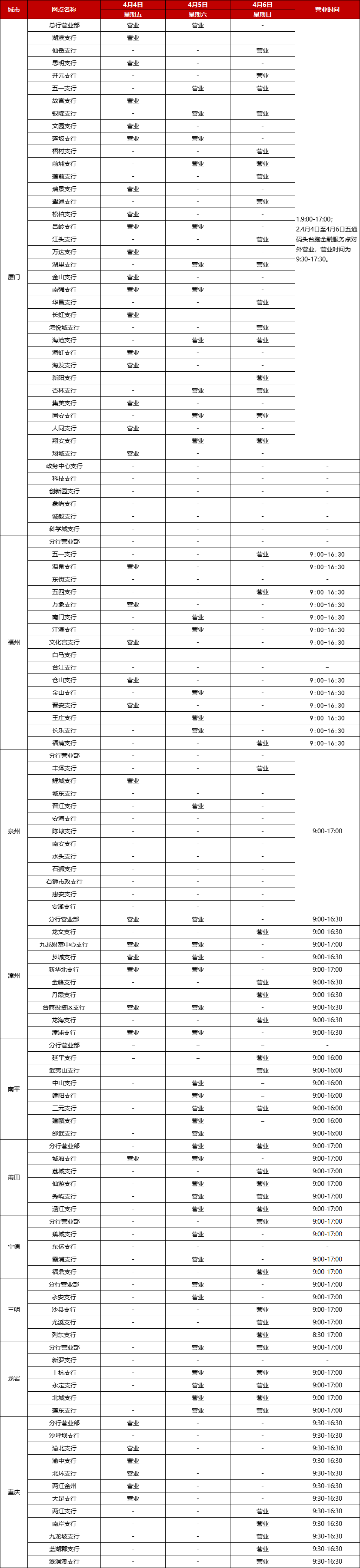 廈門銀行2025年清明節(jié)假期網(wǎng)點(diǎn)對(duì)外營業(yè)時(shí)間通告