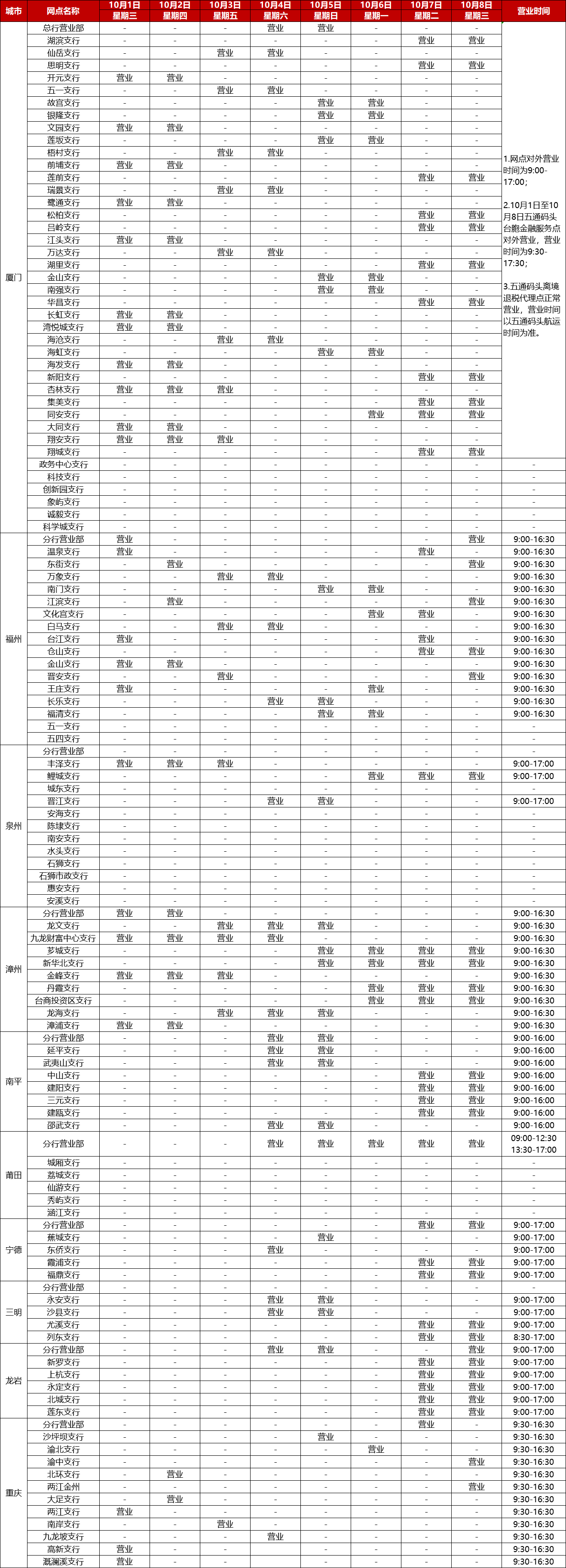 廈門銀行2025年國慶中秋節(jié)假期網點對外營業(yè)時間通告