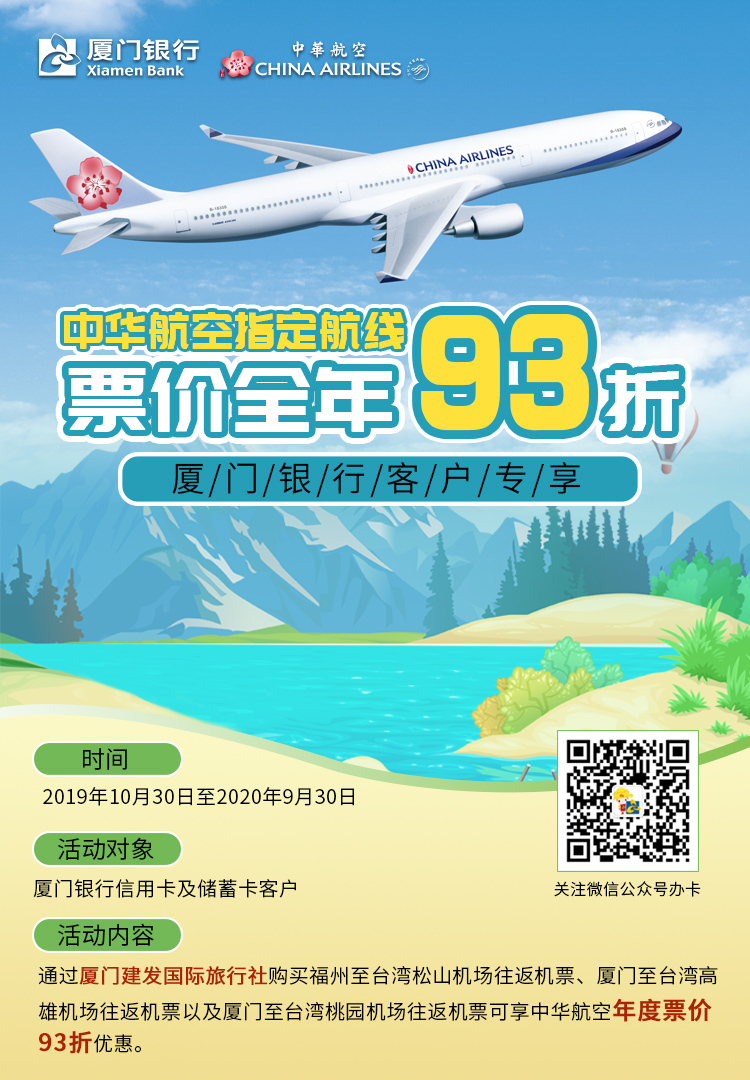 中華航空票價全年93折!廈門銀行臺胞客戶專享