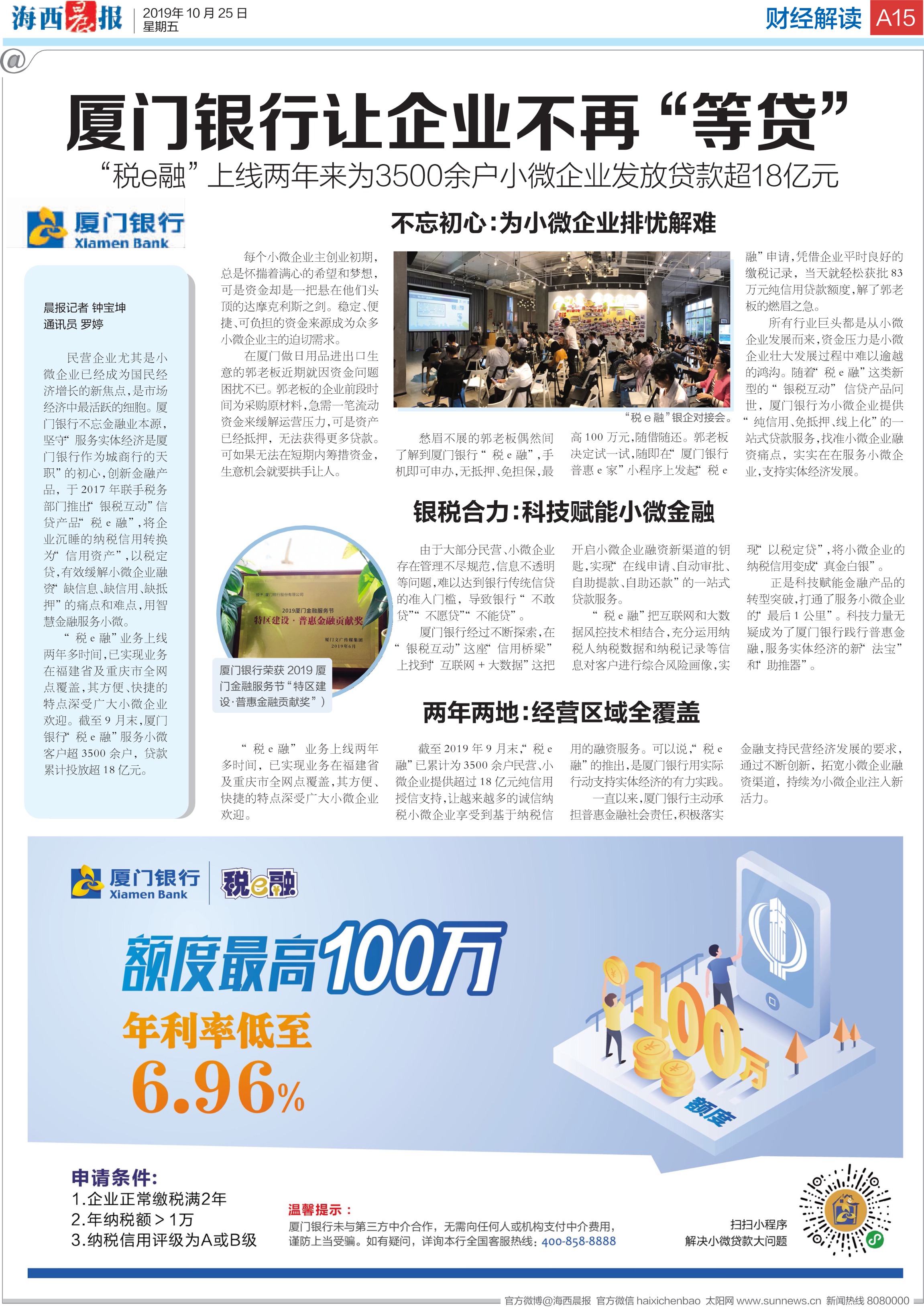 民營企業(yè)尤其是小微企業(yè)已經(jīng)成為國民經(jīng)濟(jì)增長的新焦點(diǎn),是市場(chǎng)經(jīng)濟(jì)中最活躍的細(xì)胞。廈門銀行不忘金融業(yè)本源,堅(jiān)守“服務(wù)實(shí)體經(jīng)濟(jì)是廈門銀行作為城商行的天職”的初心,創(chuàng)新金融產(chǎn)品,于2017年聯(lián)手稅務(wù)部門推出“銀稅互動(dòng)”信貸產(chǎn)品“稅e融”,將企業(yè)沉睡的納稅信用轉(zhuǎn)換為“信用資產(chǎn)”,以稅定貸,有效緩解小微企業(yè)融資“缺信息、缺信用、缺抵押”的痛點(diǎn)和難點(diǎn),用智慧金融服務(wù)小微。