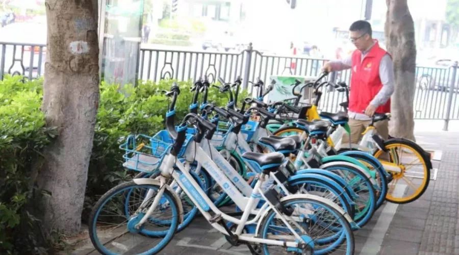 志愿者將共享單車進(jìn)行規(guī)整擺放。
