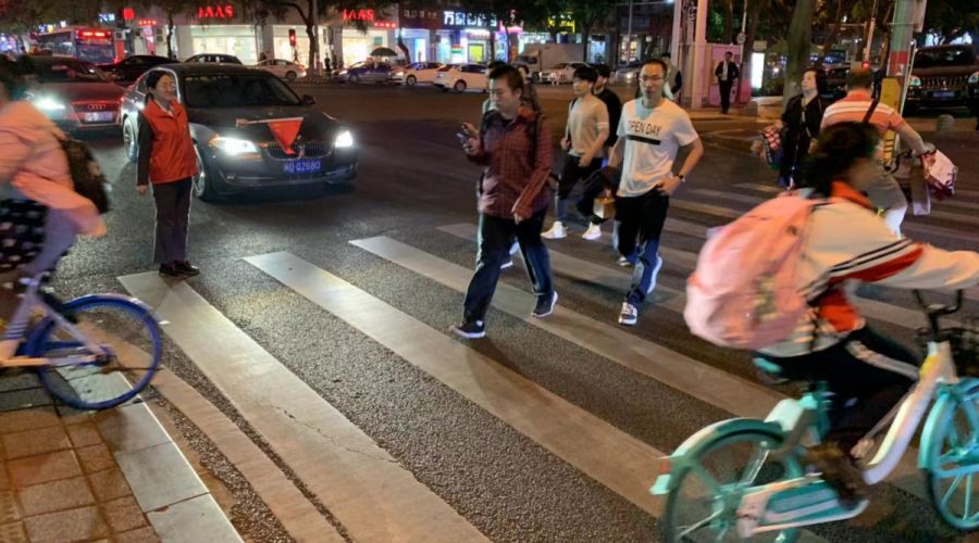志愿者進(jìn)行禮讓行人的交通督導(dǎo),倡導(dǎo)文明出行。