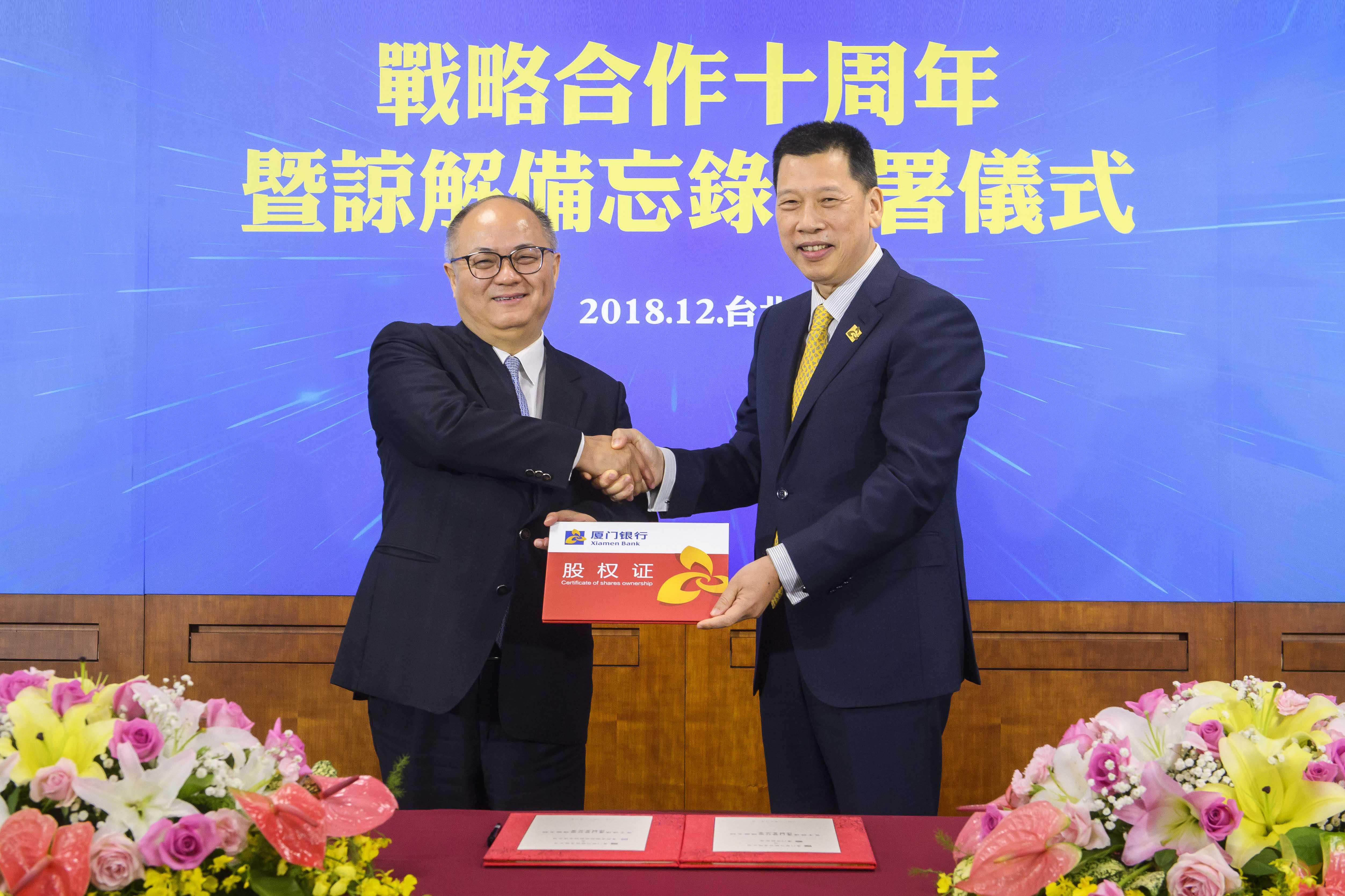 廈門銀行董事長吳世群(右)代表廈門銀行向富邦金控總經(jīng)理韓蔚廷發(fā)放股權(quán)證