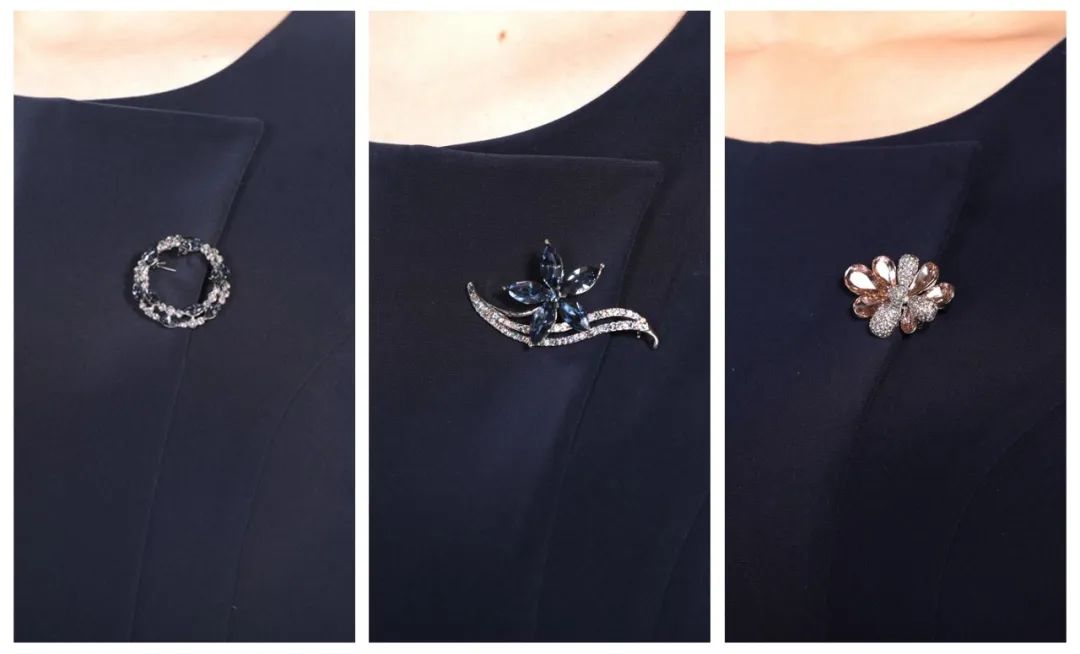 對(duì)于制服來說,胸針的樣式往往是點(diǎn)睛之筆。三款定制水晶胸針,讓女員工自由搭配,方圓之間盡顯優(yōu)雅;湛藍(lán)的小花襯托出溫婉氣質(zhì);淡淡粉色增添一絲柔美。