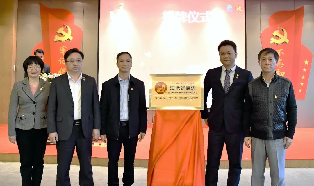 海滄區(qū)委組織部副部長、區(qū)委非公工委副書記葉偉民(左三)與廈門銀行海滄支行黨支部書記、新陽支行行長林锽钅泉(右二)共同為廈門銀行海滄支行黨支部黨建品牌揭牌