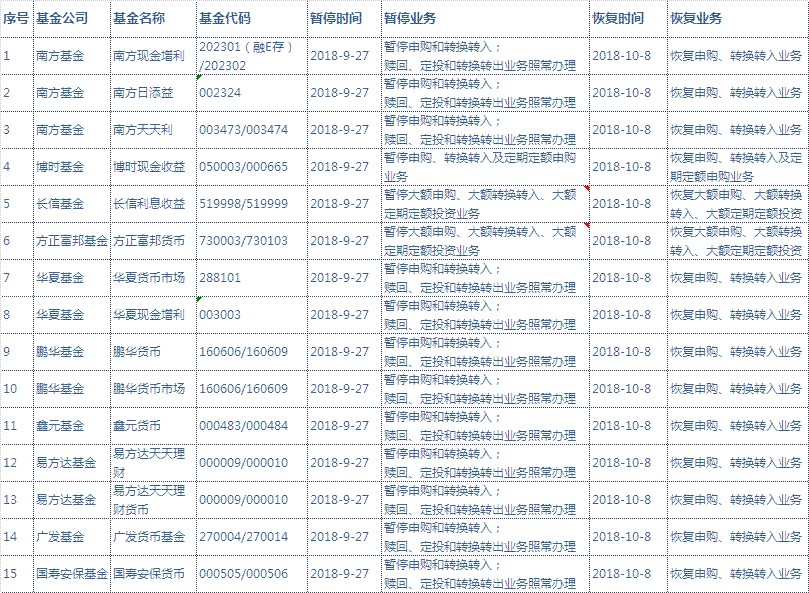 (1)2018年9月27日至10月07日,根據(jù)各基金公司安排為保護基金份額持有人貨幣型基金業(yè)務(wù)將暫停,2018年10月08日起將恢復辦理正常的申購及轉(zhuǎn)換轉(zhuǎn)入業(yè)務(wù),屆時將不再另行公告?;饡和I曩徏稗D(zhuǎn)換轉(zhuǎn)入業(yè)務(wù)期間,其他業(yè)務(wù)仍正常辦理。