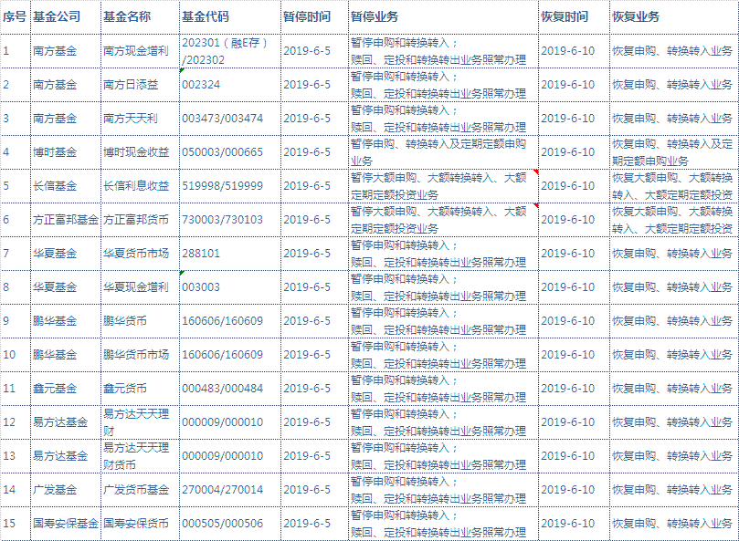 (1)2019年06月05日至2019年06月09日,根據(jù)各基金公司安排為保護基金份額持有人貨幣型基金業(yè)務將暫停,2019年06月10日起將恢復辦理正常的申購及轉(zhuǎn)換轉(zhuǎn)入業(yè)務,屆時將不再另行公告?;饡和I曩徏稗D(zhuǎn)換轉(zhuǎn)入業(yè)務期間,其他業(yè)務仍正常辦理。